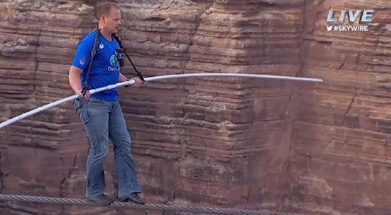 Have you ever seen the death-defying tightrope walk by Nik Wallenda over the Grand Canyon? No safety nets. No harness. Just a 2 inch cable stretching more than 1/4 mile across the canyon with winds whipping to 30 miles an hour. The swaying cable was 1500 feet in the air–higher than the Empire State Building! Wallenda balanced a 45 pound bar and knelt twice to wait out treacherous winds. The heart-stopping footage, broadcast live on national TV, captured the expanse below as a helicopter circled him on the wire. It took Wallenda, a seventh generation descendant of the famous Flying Wallendas, over 20 minutes to cross the gorge.
